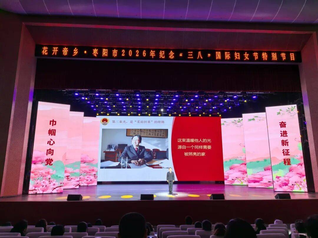 三月春光正好,第116个“三八”国际妇女节如约而至。在这个美好的日子里,枣阳市检察院积极响应市委号召,走进枣阳市2026年纪念“三八”国际妇女节特别活动现场,以一场有温度、有深度、有力量的表演,致敬“心尖上的守护者”。该院以未成年人检察官张红霞同志的先进事迹为主线,通过事迹宣讲、干警合唱展现了新时代女检察干警的巾帼风采,传递司法温情,凝聚守护合力。